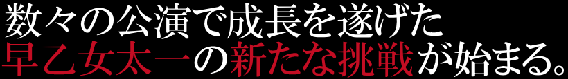 5年間、研鑽をつんだ劇団員、豪華ゲスト、そして、芝居には、新たに劇団☆新感線の座付き作家・中島かずき、スーパー歌舞伎なども手掛ける劇団・扉座の主宰横内謙介が作品を提供。早乙女太一も総合プロデュースに加えて、演出、振付、脚本も手掛ける。 全てを詰め込んだ“大衆演劇”の誕生だ。